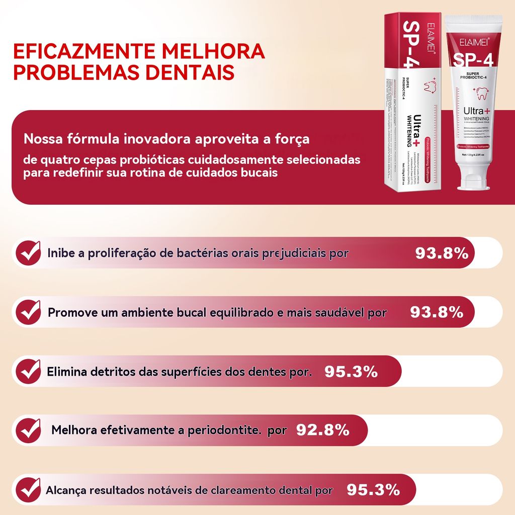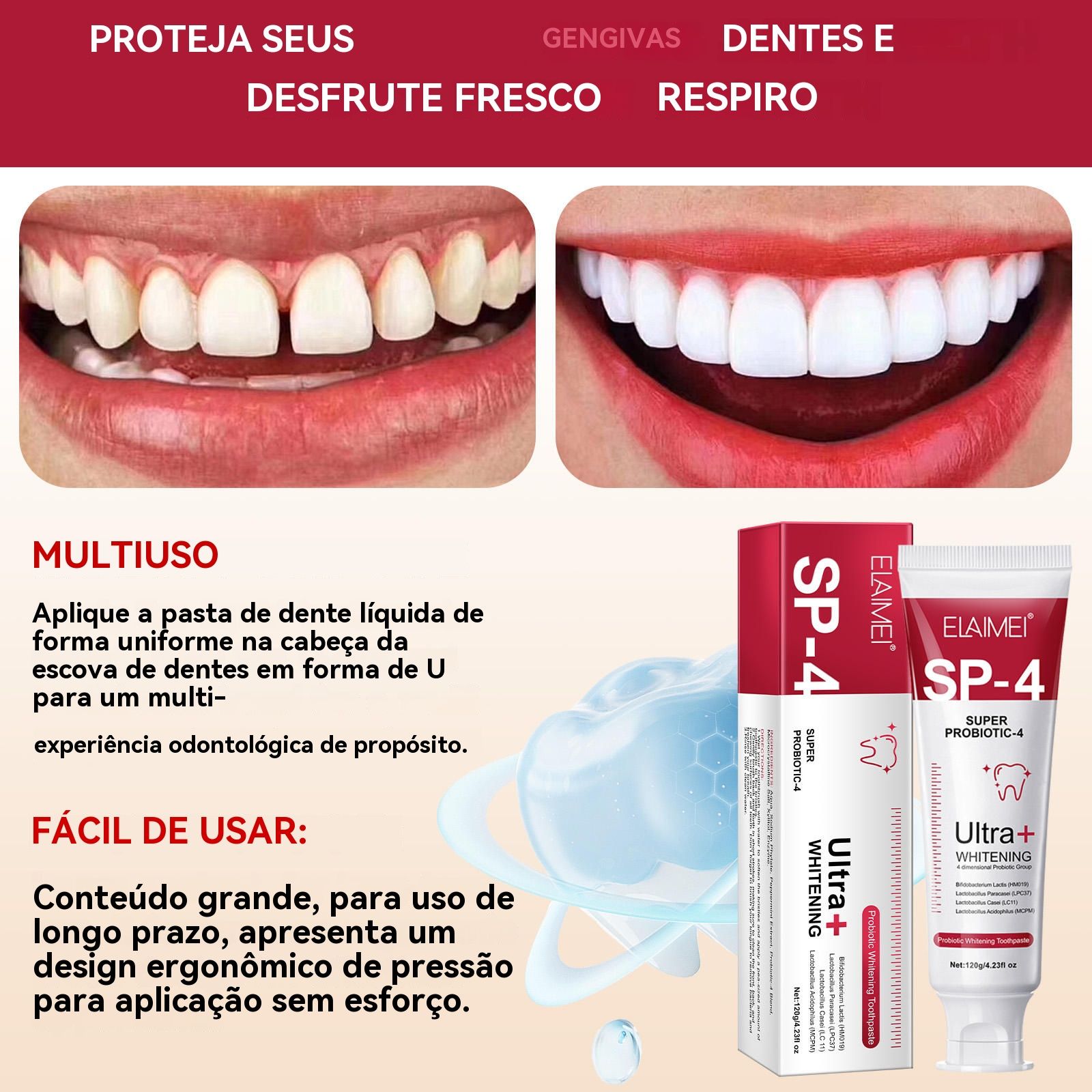 Este é o creme dental branqueador probiótico ELAIMEI SP-4 ✨, focado em "cuidado bucal com probióticos + branqueamento potente" — detalhes que acertam exatamente o que a boca precisa: